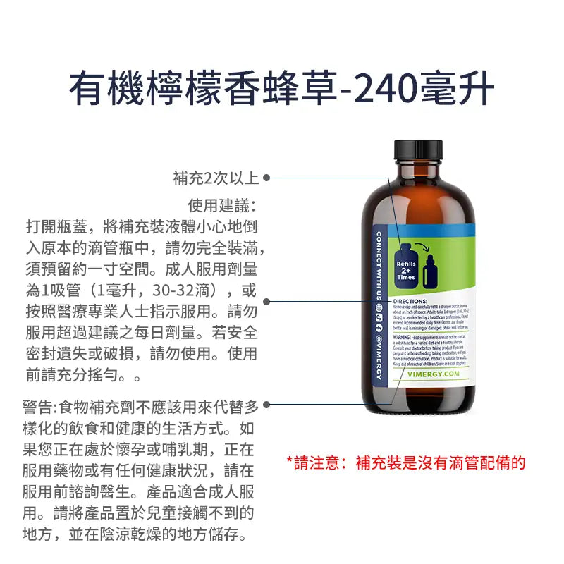 Vimergy 採用濃縮液體萃取技術,其有機檸檬香蜂草萃取液是一種極其有效的 10 倍濃縮配方。每1毫升含有 175