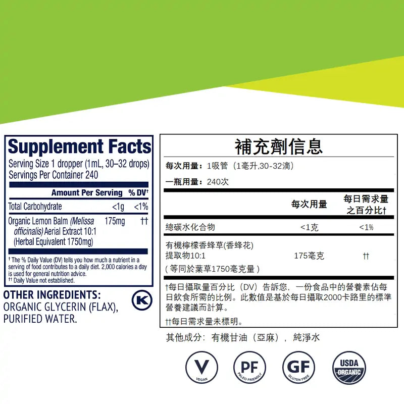 毫克檸檬香蜂草萃取物,相當於1750毫克的新鮮草本植物。相比膠囊、軟糖或片劑,濃縮液體配方能更快被人體吸收,且不含不必要的糖、黏合劑或填充劑,確保成分純淨高效。